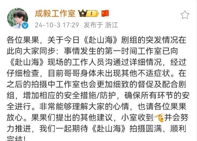 也在文章中为剧组说话,称每一场打戏,武术组都会尽量的保护演员,而且工作室也出面表示,会继续跟剧组沟通加强防护措施。