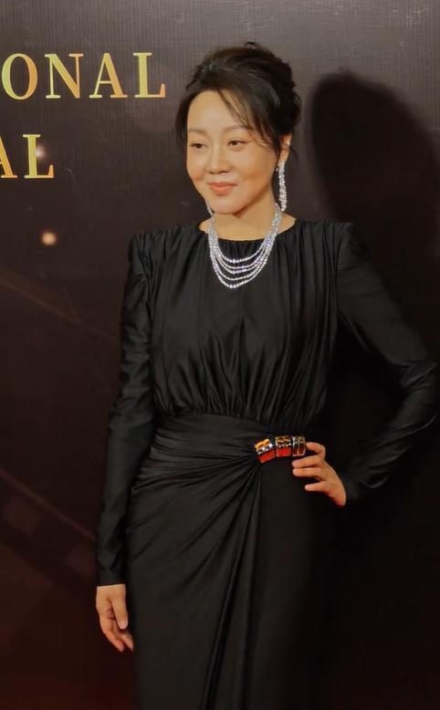 红毯上闫妮穿着打扮都特别大气,一件黑色褶皱长裙凸显曲线优势。